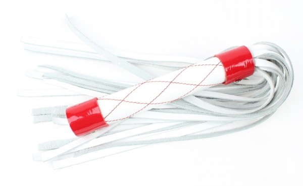 Плеть-многохвостка, из натуральной кожи белого цвета с красным декором - это, лучший вариант для самого первого ударного девайса!